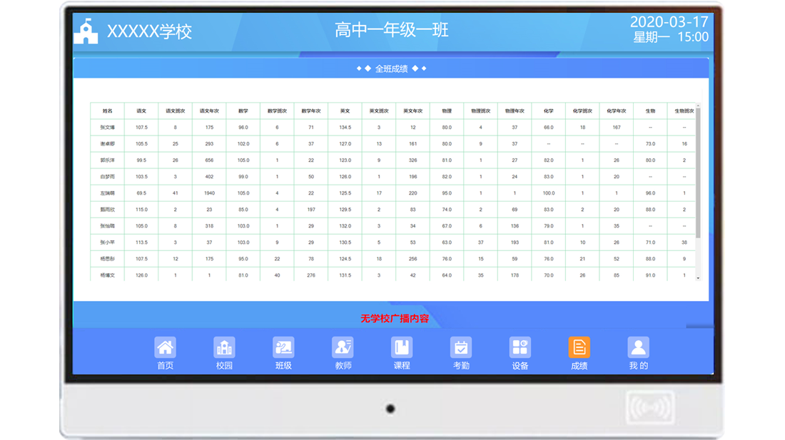 成績(jī)部分顯示全班同學(xué)各科成績(jī)及總成績(jī),在班級(jí)、年級(jí)的排名情況等信息。