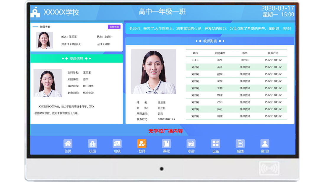 可通過(guò)該模塊與學(xué)校排課/選課系統(tǒng)進(jìn)行對(duì)接,實(shí)時(shí)顯示授課信息(課程、時(shí)間、授課老師等)